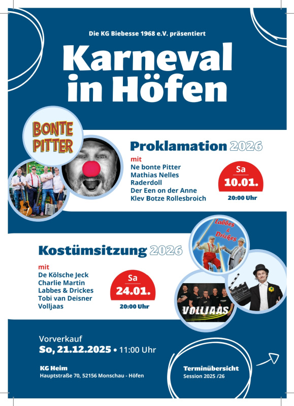 Der Kartenvorverkauf für die Prinzenproklamation am 10.01.2026 und Kostümsitzung am 24.01.2026,
